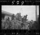 Jewish men and women residents standing in horse-drawn cart in the ghetto