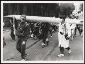 Anti-nuclear protesters walk through the streets holding a large replica rocket