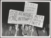 Protesters hold up placards against Italian politician Bettino Craxi, comparing him to dictator Benito Mussolini, and accusing him of involvement in the Masonic Lodge 'P2'