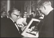 The astronauts from Apollo 11, Neil Armstrong, Michael Collins and Buzz Aldrin being presented with a framed photo of their landing on the moon