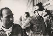 A firefighter with a makeshift mask outside a building damaged after the Belice earthquake, Sicily 1968