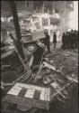 A group of men taking a close look at a burnt out car lying across railway tracks, Battipaglia, 1969