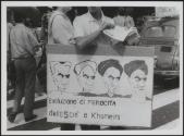 A young man wears a protest placard around his neck with cartoons of Iranian leader Khomeini