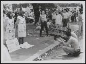 Two men aim their wooden rifles at two blindfolded women in a protest against Iranian leader Khomeini