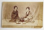 Mediumbox: albumen print inset in cover of black lacquer box, embellished with birds and bullrushes motif