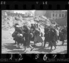 Group of women with sacks and pails walking past synagogue in ruins heading for deportation